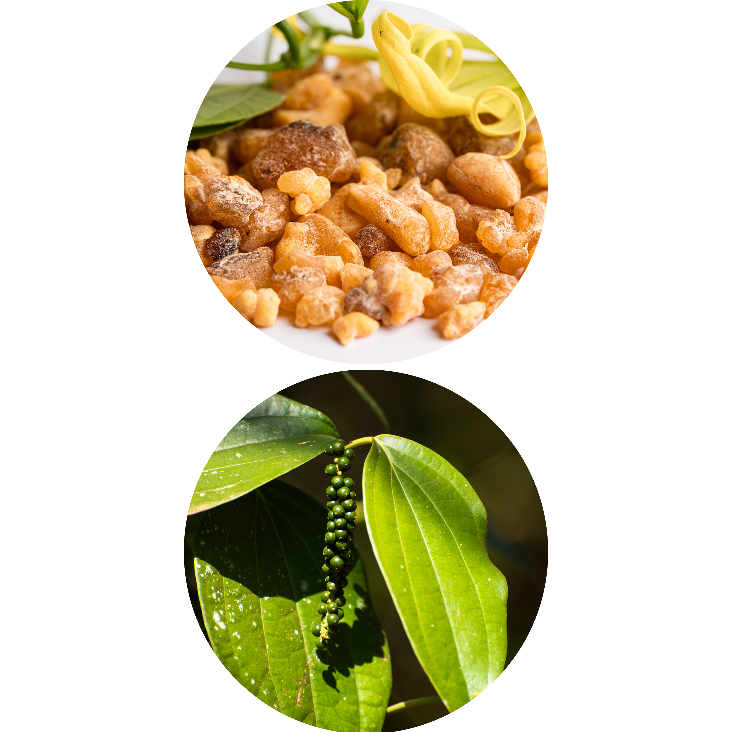 Frankincense soothes irritated skin and promotes healing with its anti-inflammatory properties while Black Pepper promotes blood flow.