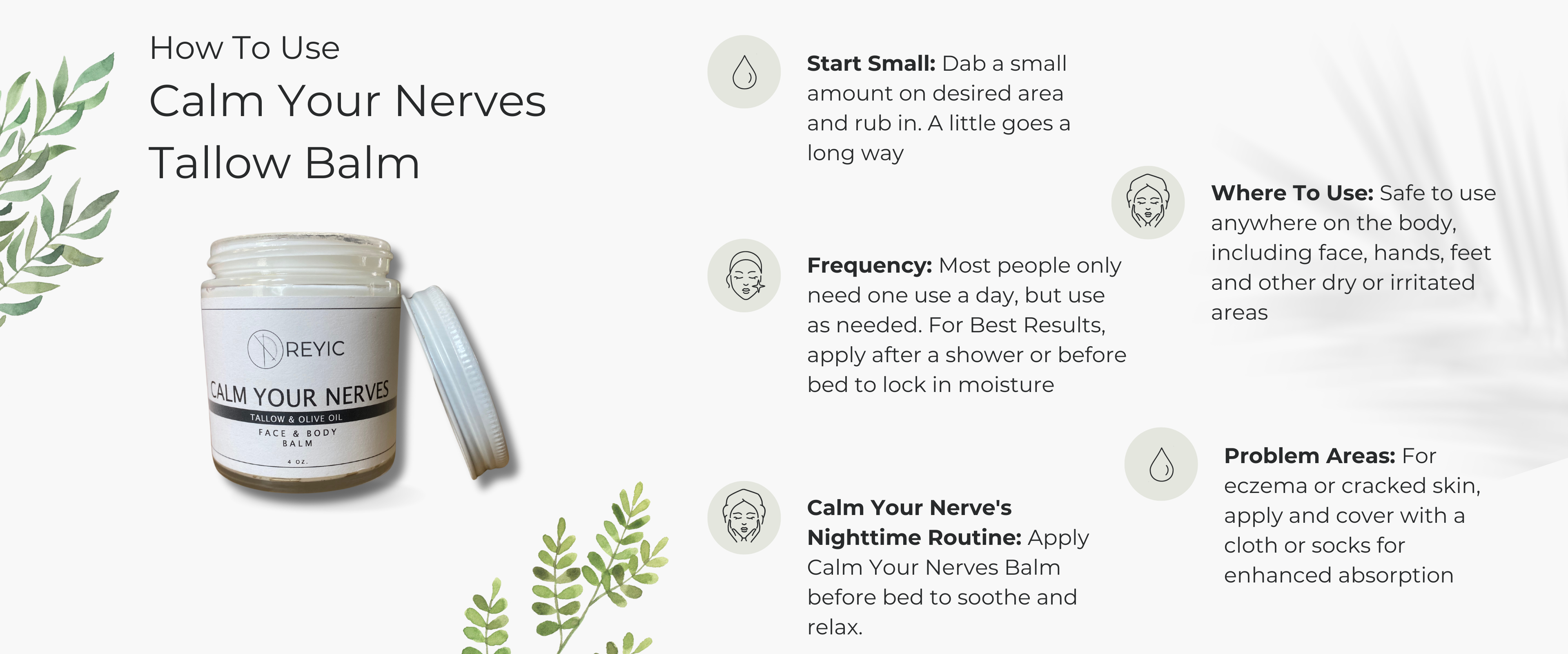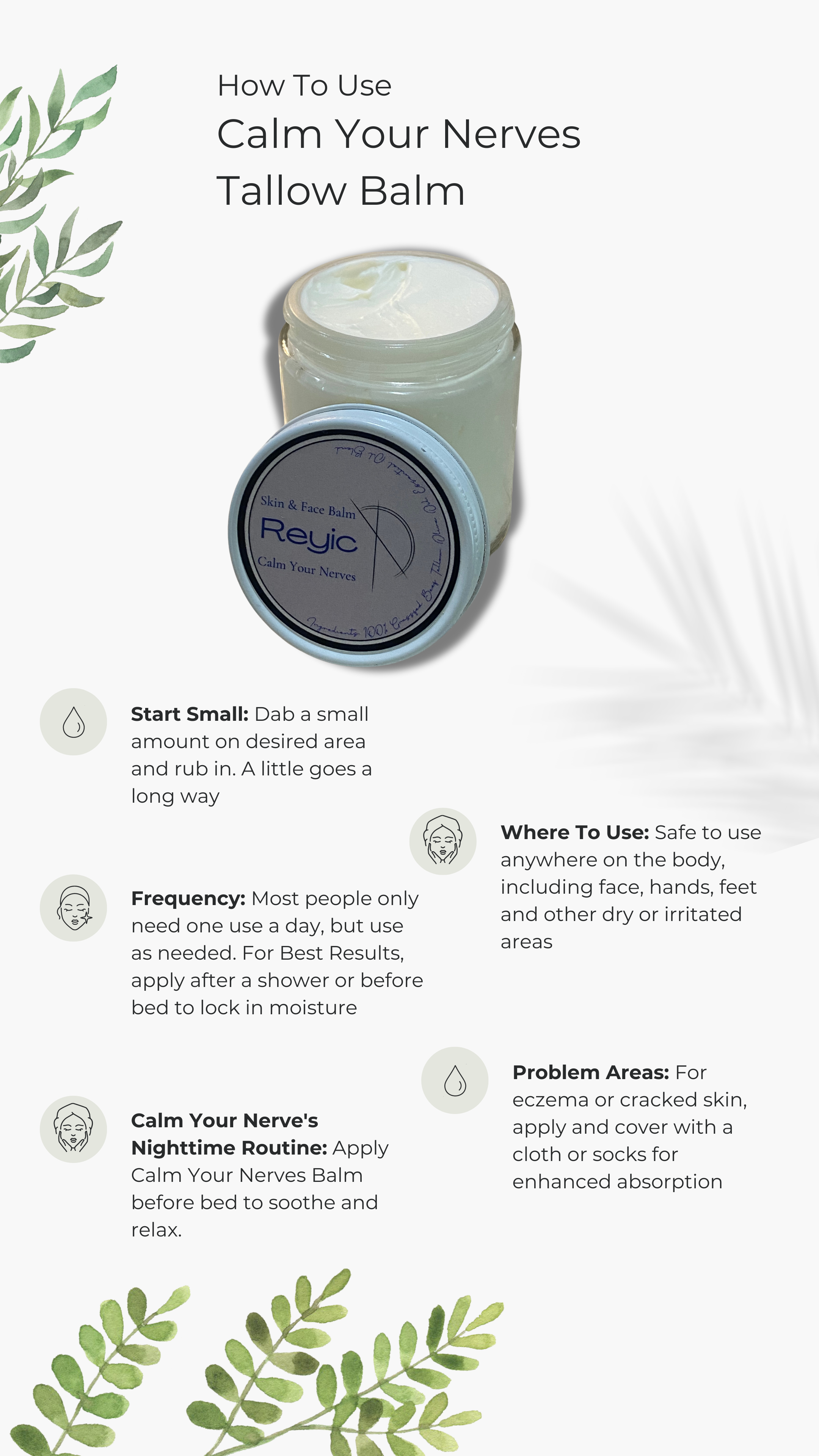 Experience the soothing power of tradition with our Calm Your Nerves Tallow Balm. Combining the timeless benefits of tallow and olive oil, used for over 5,000 years, with a calming blend of essential oils, this balm helps you relax and unwind. Perfect for easing stress and promoting a sense of tranquility, it's your natural solution for a peaceful day.