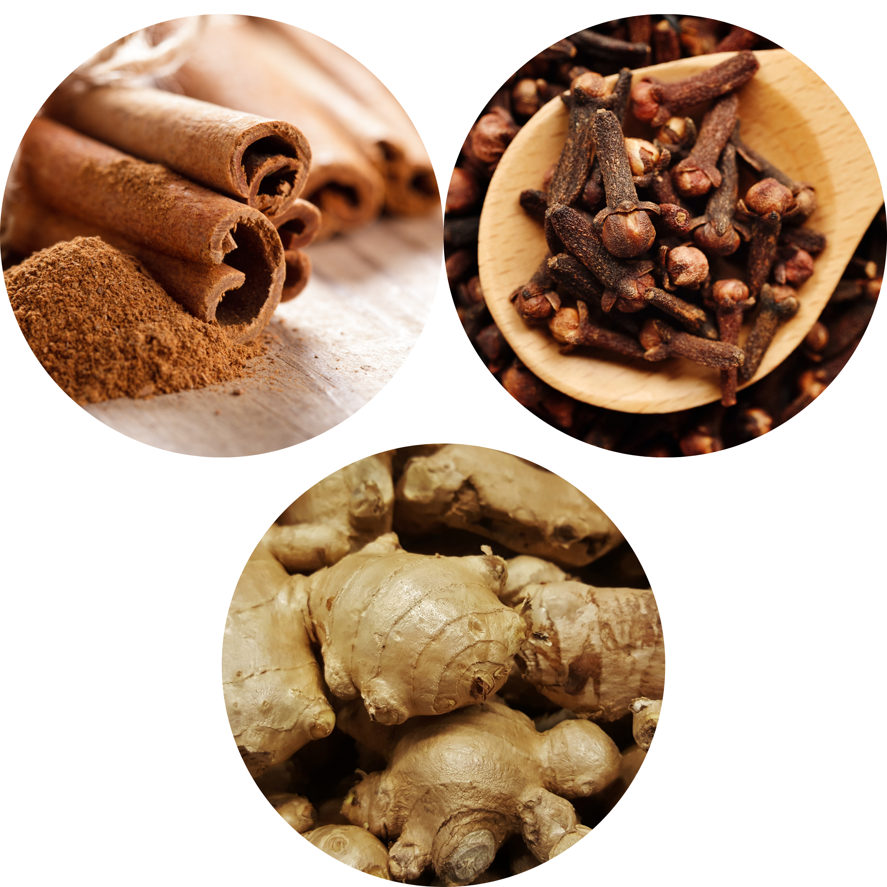 Cinnamon Bark Oil, Clove Bud Oil, and Ginger Root Extract provide a warming sensation by stimulating circulation and offering comfort.