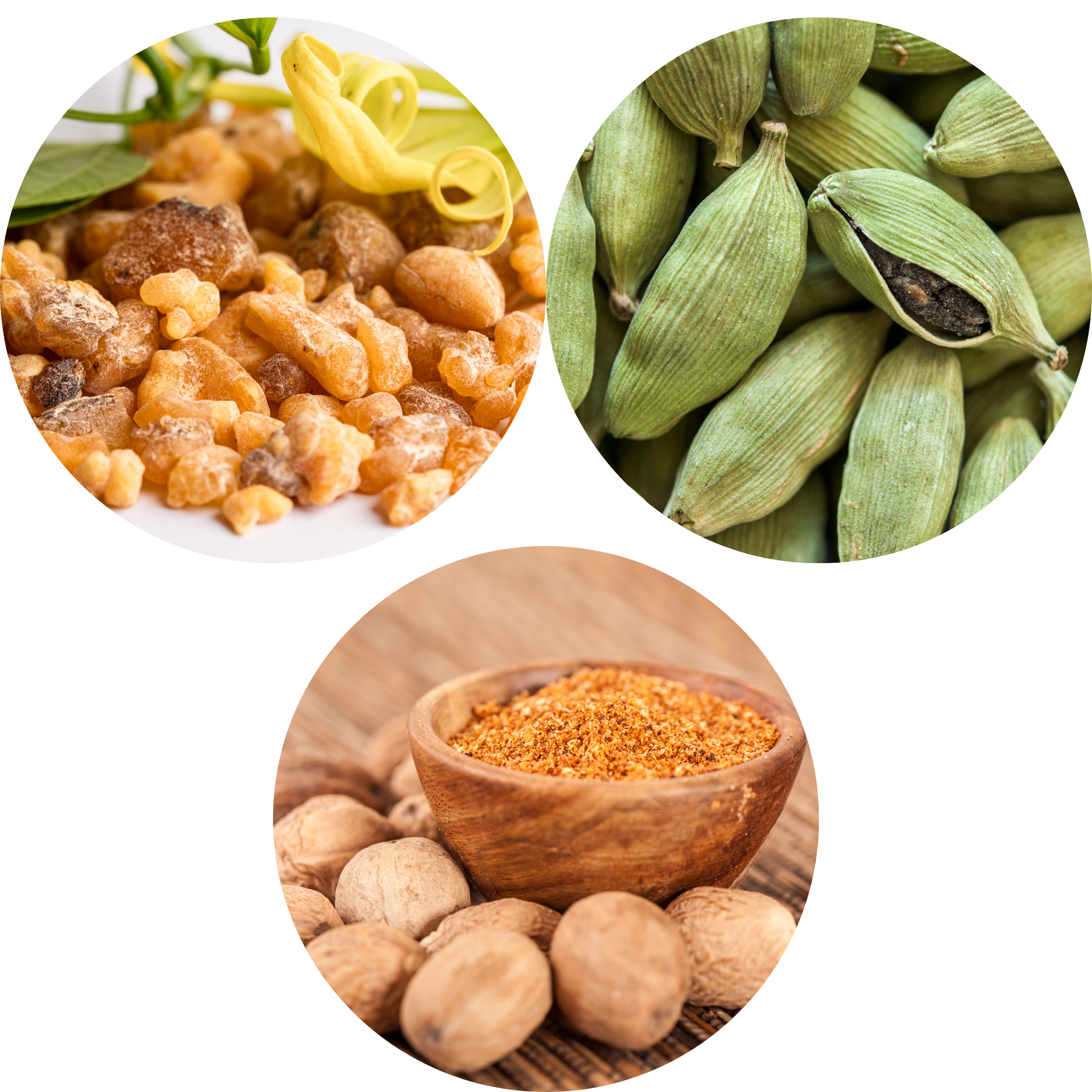 Frankincense, Cardamom Seed Oil, and Nutmeg Kernel Oil help repair and restore damaged skin through their regenerative and anti-inflammatory effects.